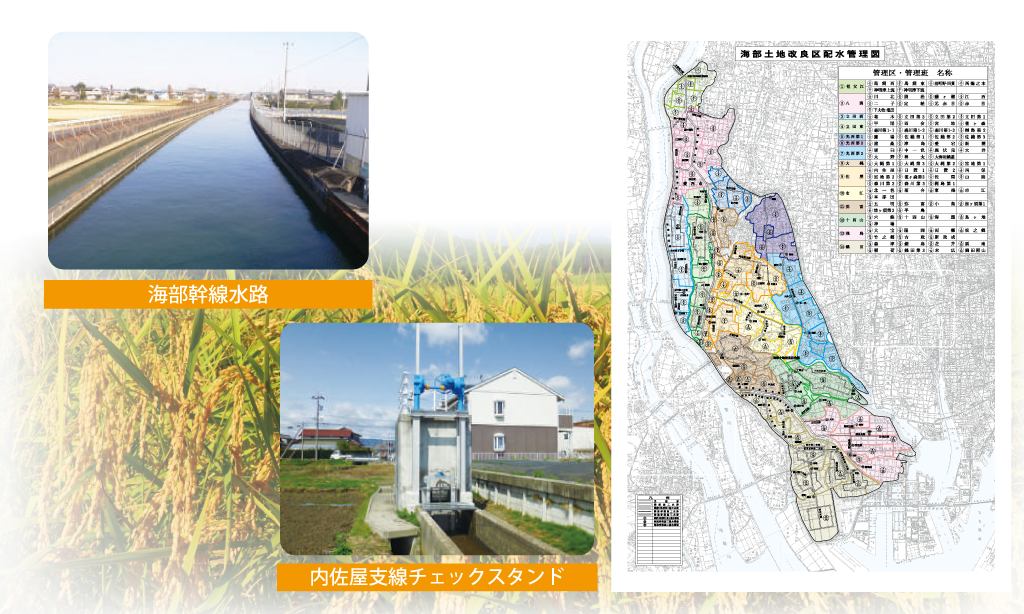 海部土地改良区は濃尾平野の西南端部木曽川の河口デルタ地帯に位置し、木曽川と日光川に囲まれた地域である。津島市、稲沢市、愛西市、弥富市、海部郡蟹江町及び飛島村4市2ヶ町村にまたがり、木曽川を水源とし約5,000haをかんがいしている。